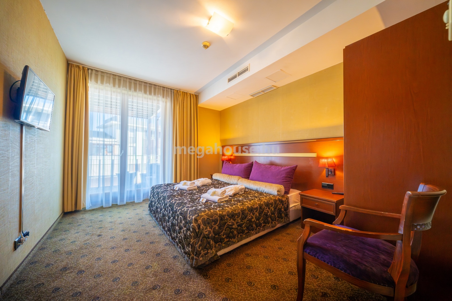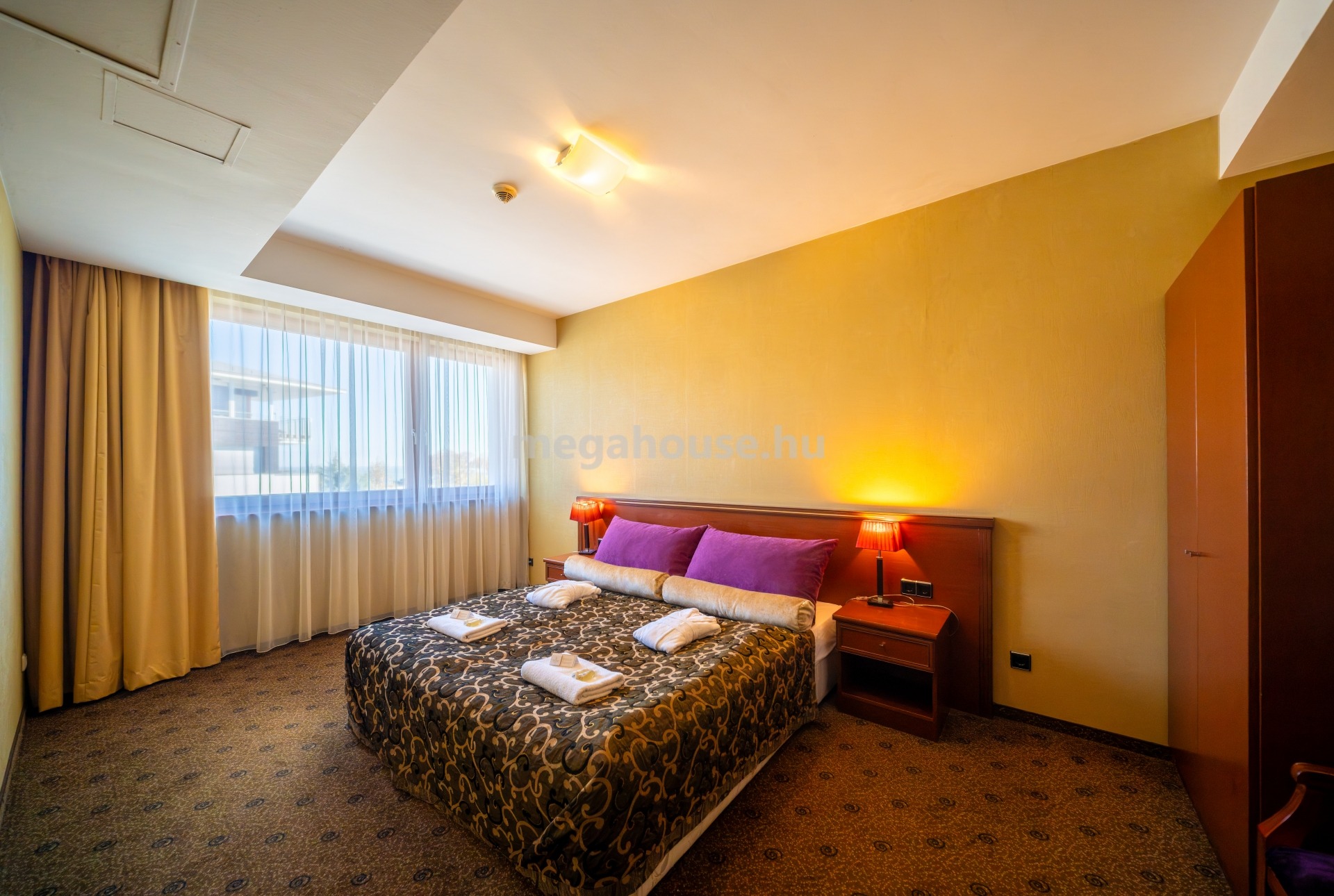 Padlózata szőnyeg, nyílászárók műanyag, két rétegű üvegezéssel.