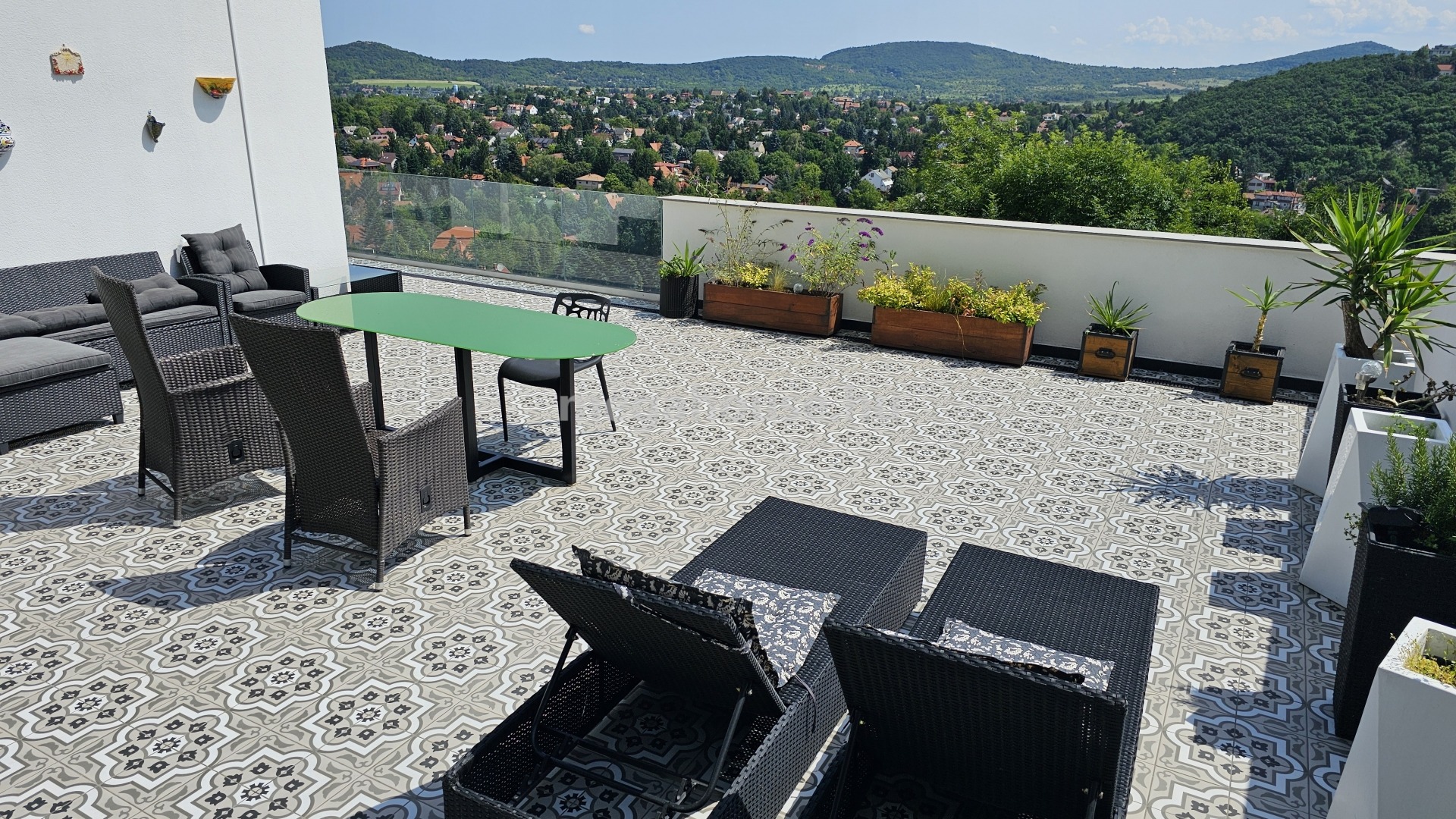 Az épület mögötti erdőrész és a terasz panorámája egyedülálló különlegesség az ingatlanpiacon.