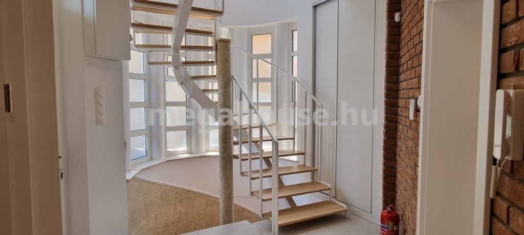 A légies csigalépcsőn jutunk az emelet világos és tágas hálószobáihoz ahol a szennyes ledobóval kiépített kádas-zuhanyozós fürdőszoba mellet külön wc is megtalálható, valamint egy gardrób szoba teljes polcrendszerrel.