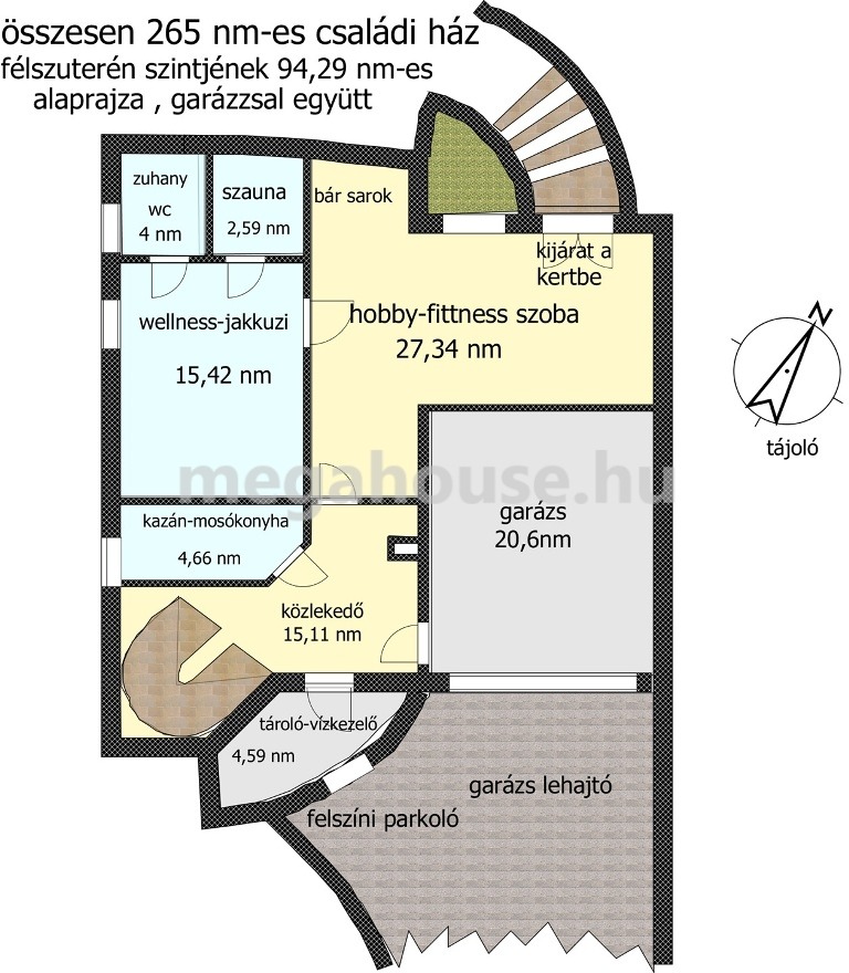 A félszuterén szinten a gépészeti helyiségek és egy kisebb autónak helyet adó garázs mellett a wellness részleg (jakuzzival és finn szaunával), valamint a kertkapcsolatos hobby szoba is kialakításra került.