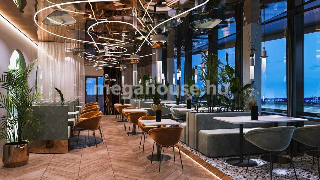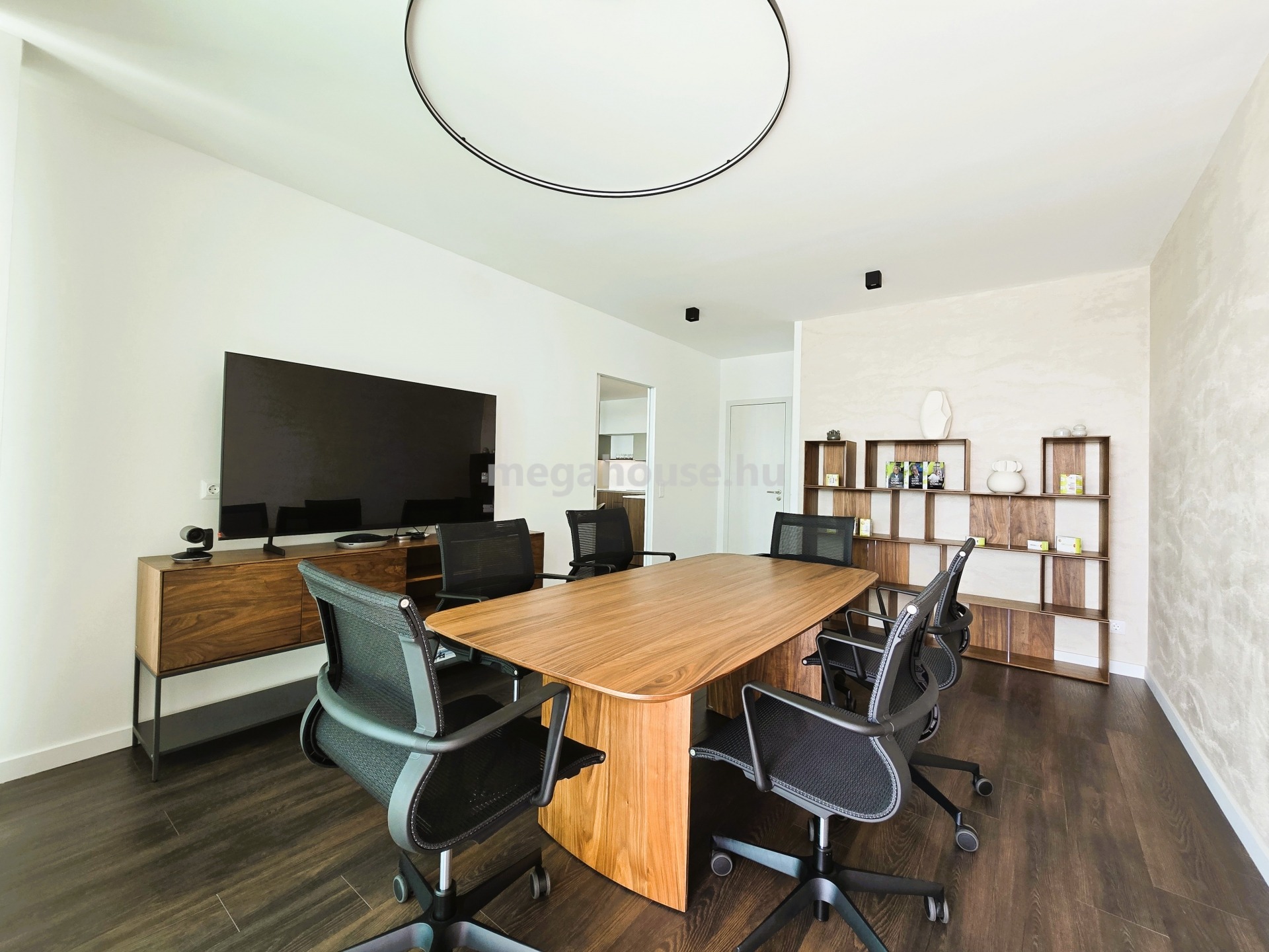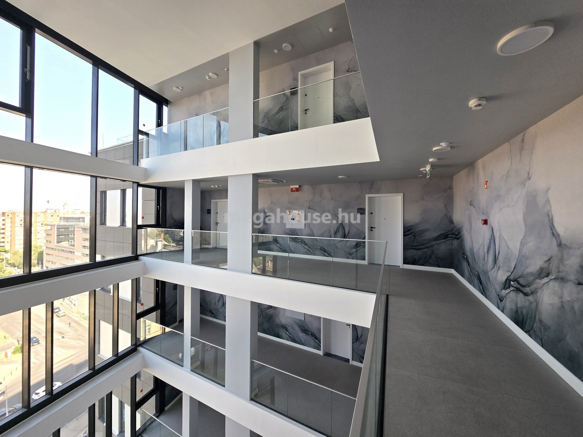 A LIFTES épület 10. emeleten található, nyugati tájolású, természetes fényben úszó lakás előteréből nyílik jobb kéz felől egy tágas fürdőszoba walk-in zuhanykabinnal, bal kéz felől a folyosón a vendég WC kapott helyet. A lakás jelenleg irodaként funkcionál, berendezése is ennek megfelelő. A bejárattal szemben található a vezetői iroda, mellette egy másik szoba helyezkedik el. A lakás központi részén az amerikai konyhás – nappali tér található, amelynek prémium minőségű konyhája MIELE gépekkel felszerelt. A nappaliból nyíló tárgyaló mellett külön helyiségben található a kádas és zuhanyzós fürdőszoba és a mellékhelyiség. A csodaszép dunai panorámával rendelkező terasz szervesen kapcsolódik az ingatlanhoz, gyakorlatilag minden szoba teraszkapcsolatos.