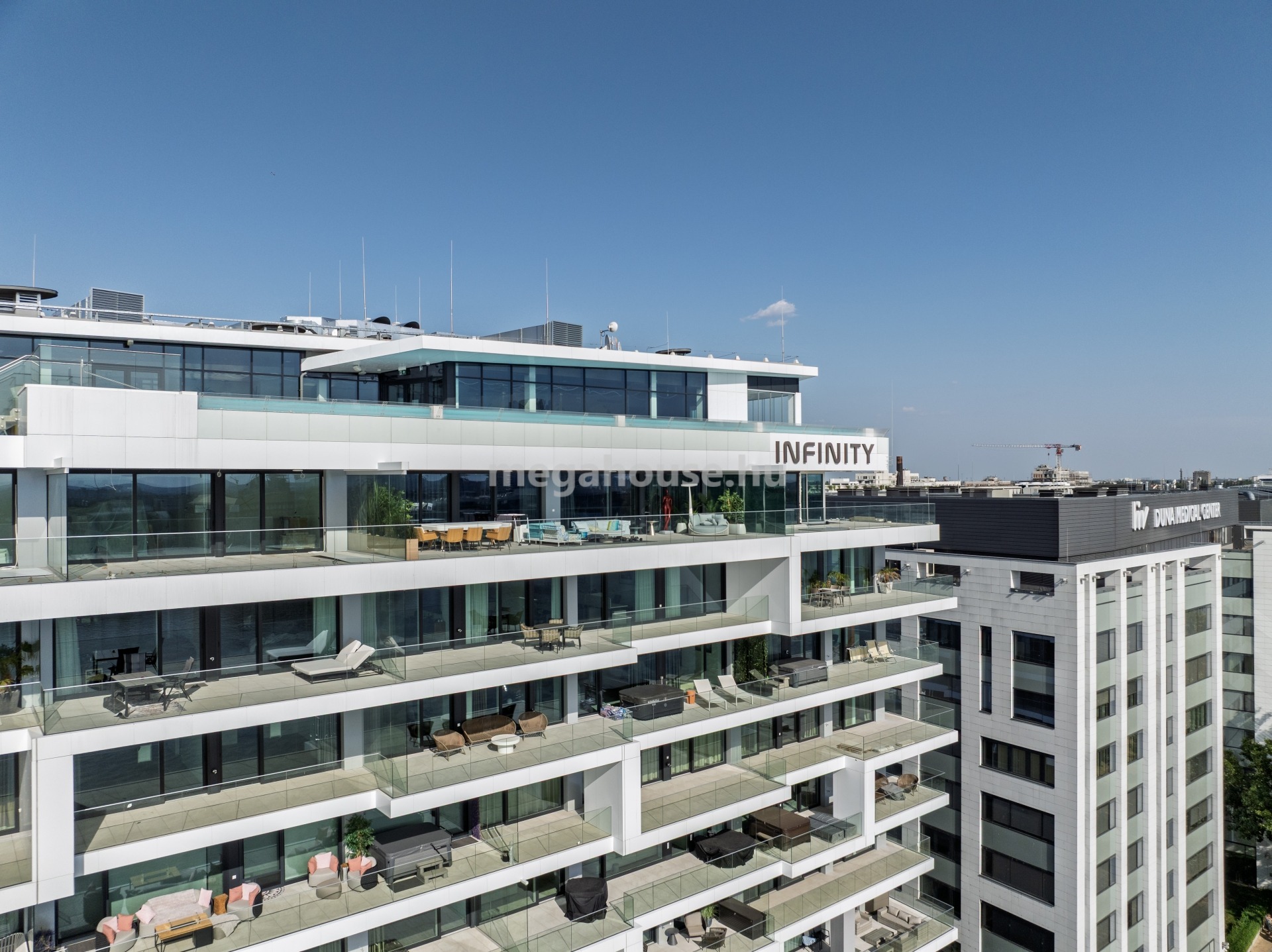 EXKLUZÍV KÖRNYEZETBEN, a prémium minőségű INFINITY épületének 10. emeletén nettó 123 nm alapterületű nappali + 3 szobás lakás közel 50 nm teraszkapcsolattal nettó 7.000 EUR / hó bérleti díj + rezsi költségek mellett kiadó, a 2 kiváló teremgarázshely bérleti díja és a közös költség további 300 EUR / hó.