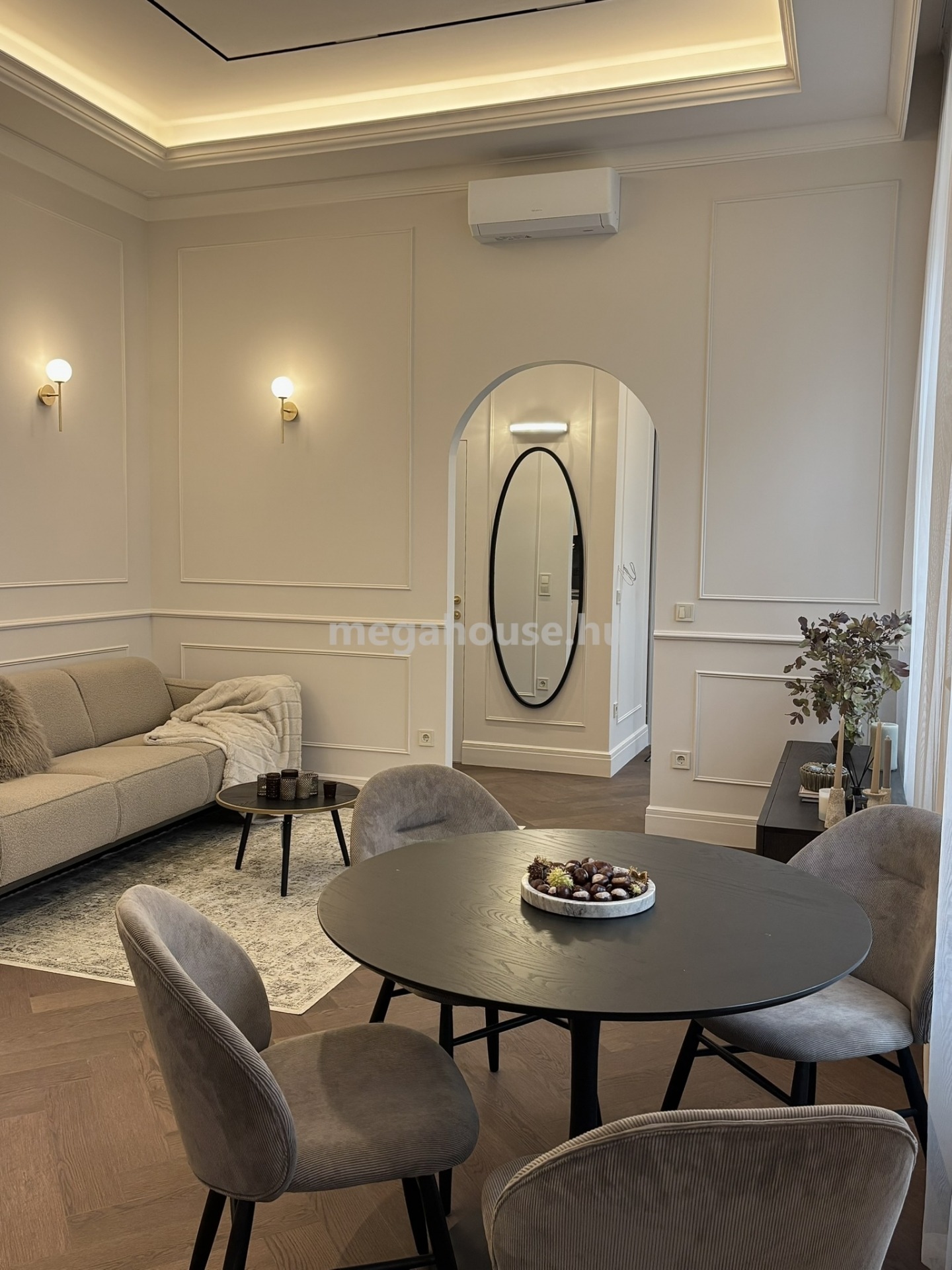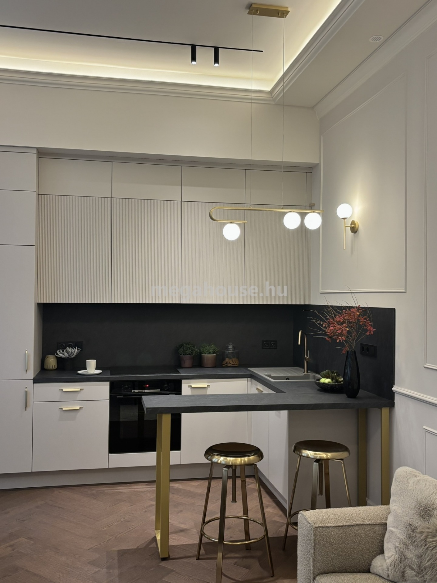 A koncepció a századfordulós bérpaloták időtlen eleganciáját ötvözi a kortárs formavilág tisztaságával, így az otthon egyszerre klasszikus és modern.