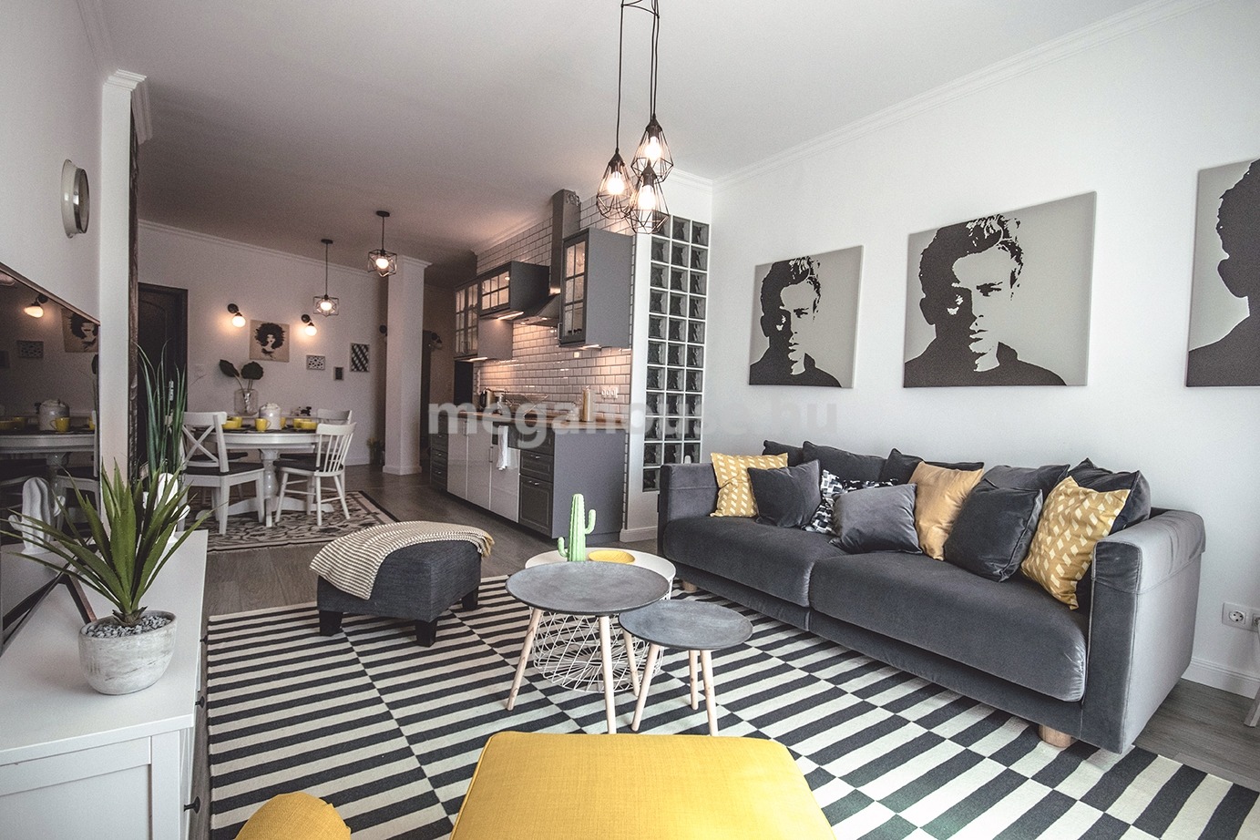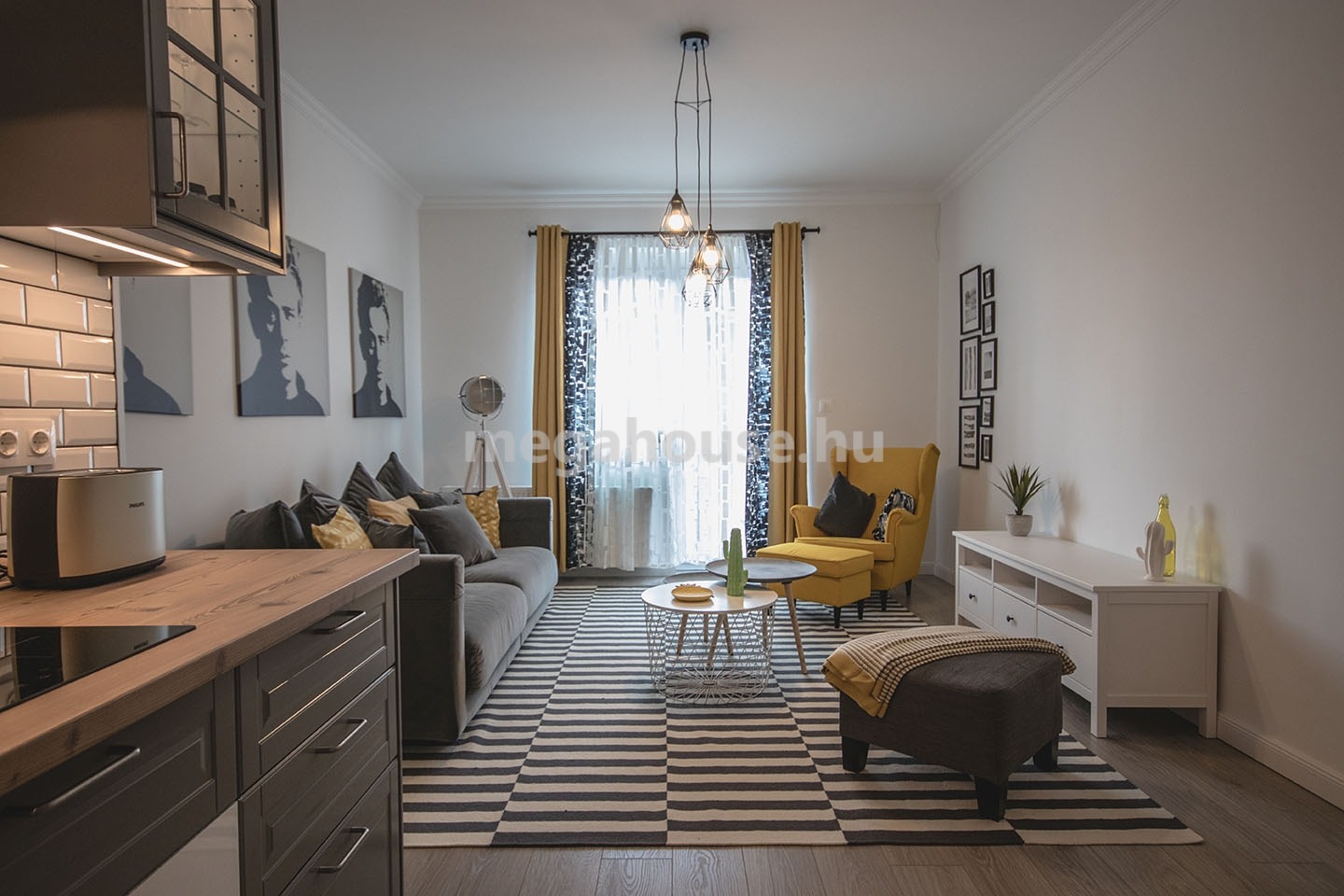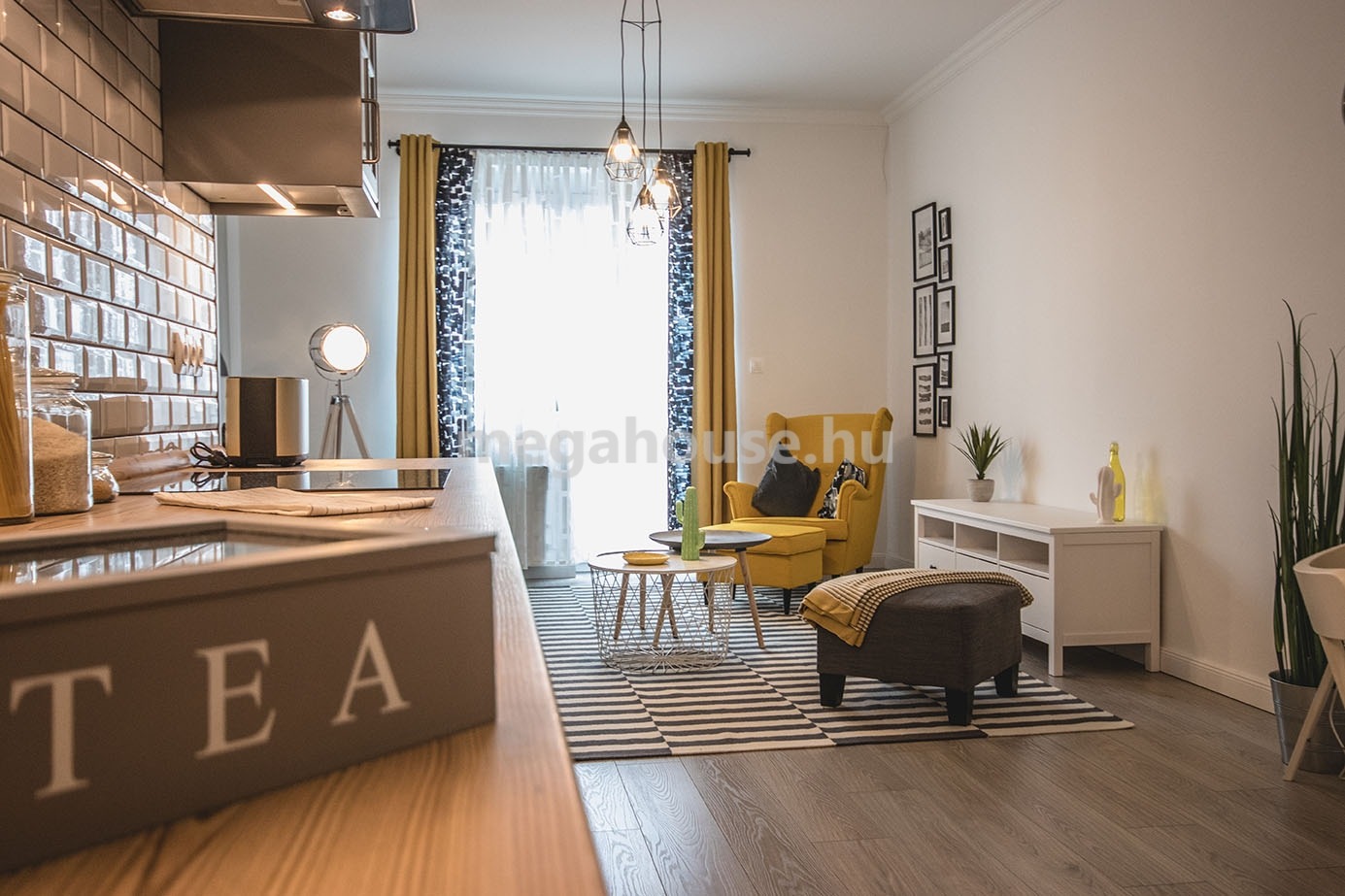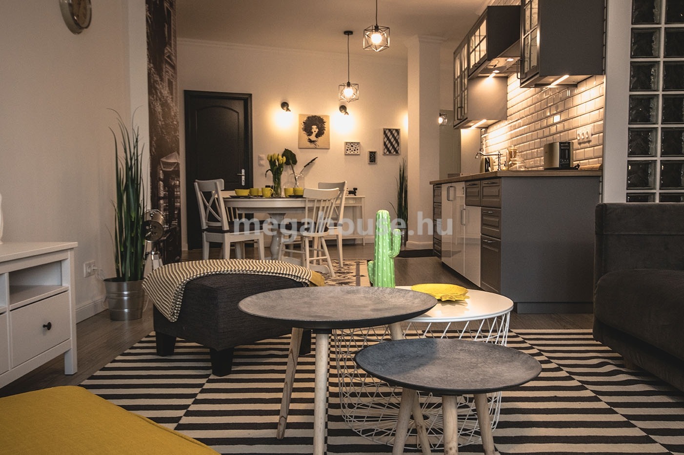 Tágas nappali étkezővel és konyhával egy légtérben