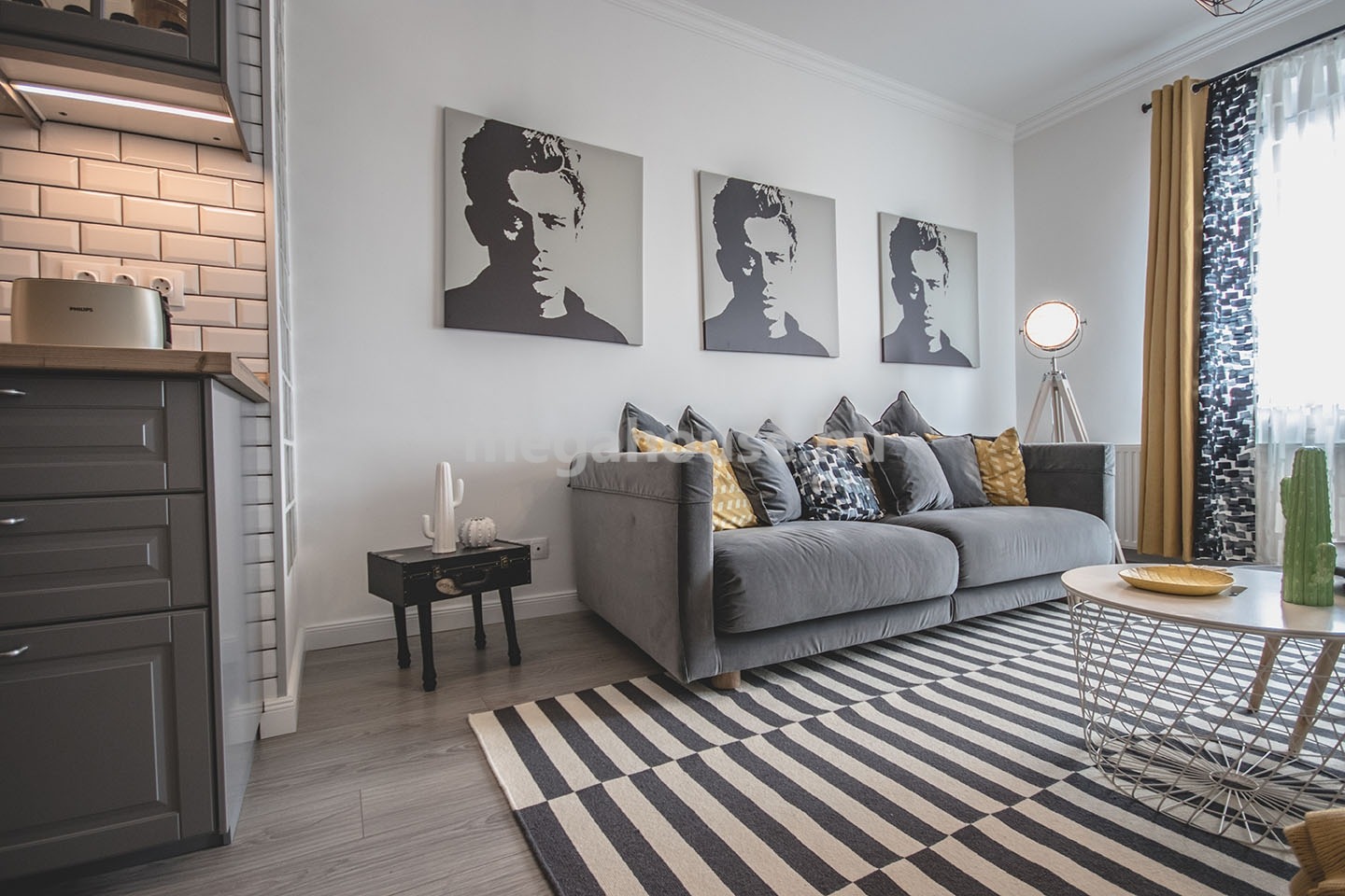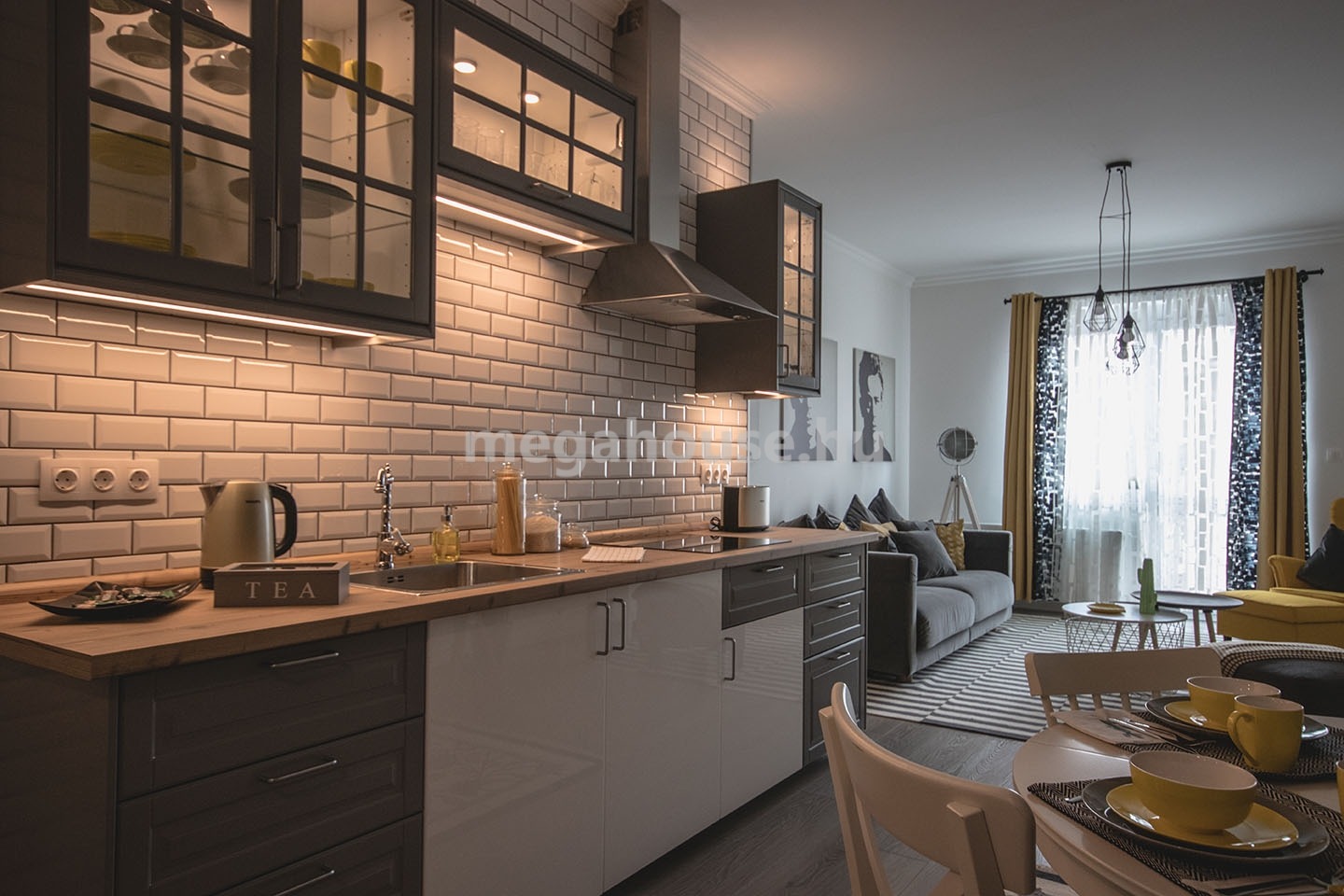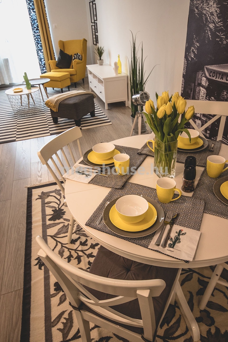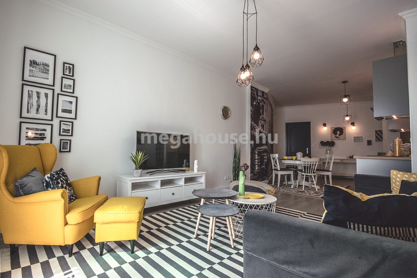 Tágas nappali étkezővel és konyhával egy légtérben