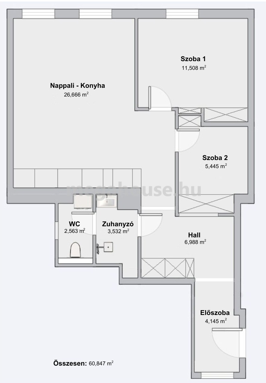Praktikus elrendezésű lakás, tágas amerikai konyhás nappalival és két különnyíló szobával, külön fürdővel és WC-vel, jól kihasználható előszobával és közlekedőkkel.