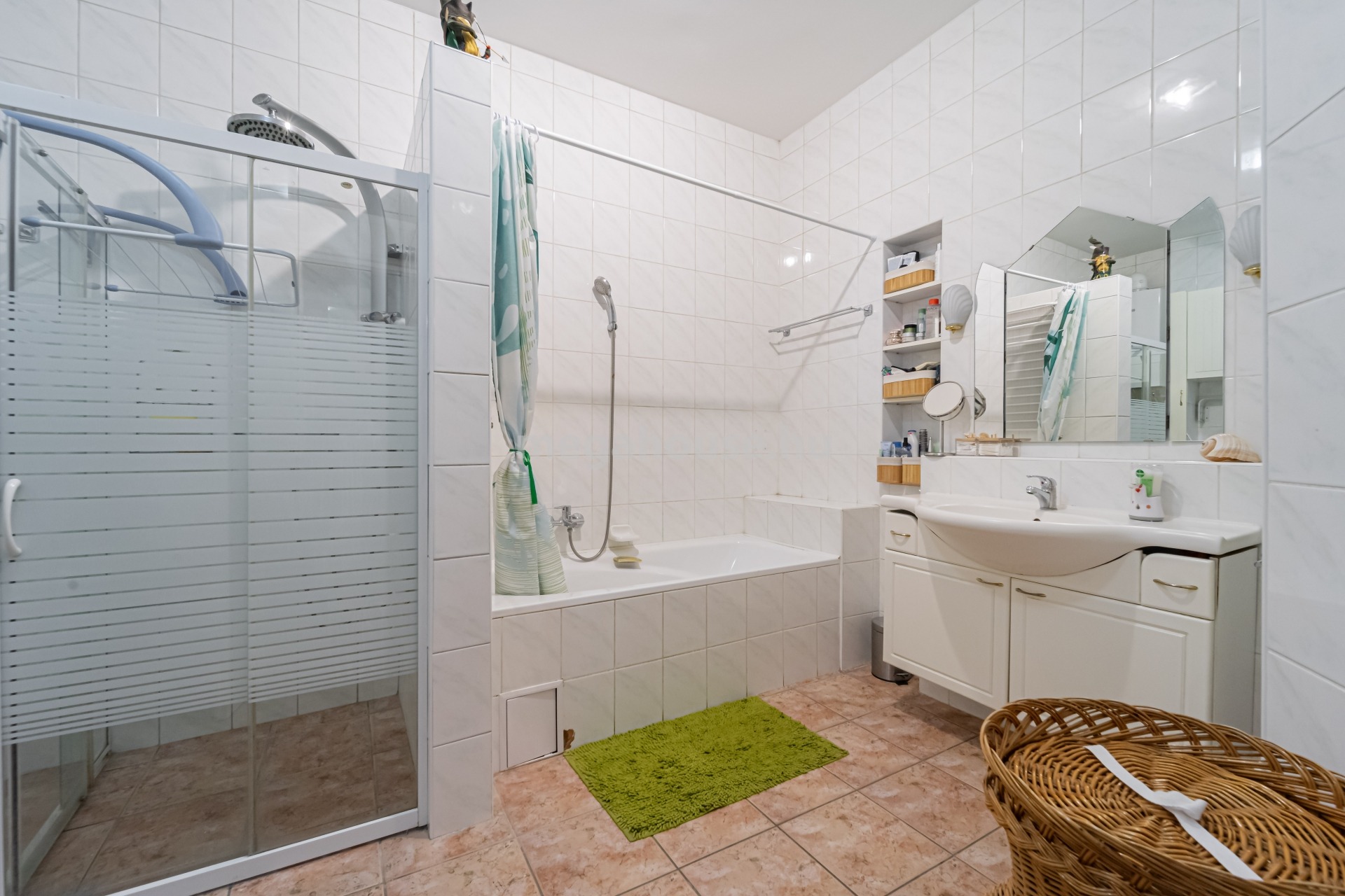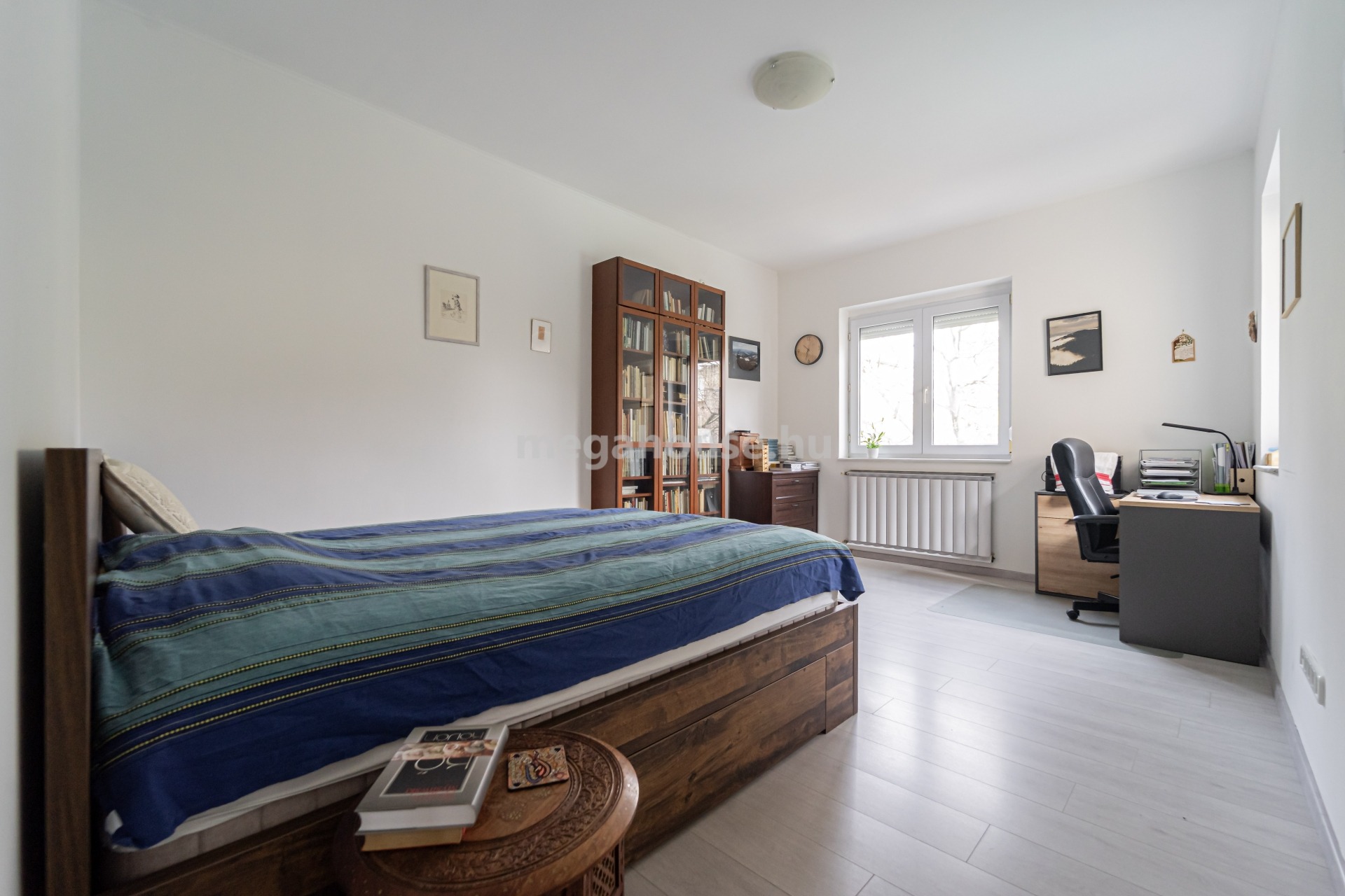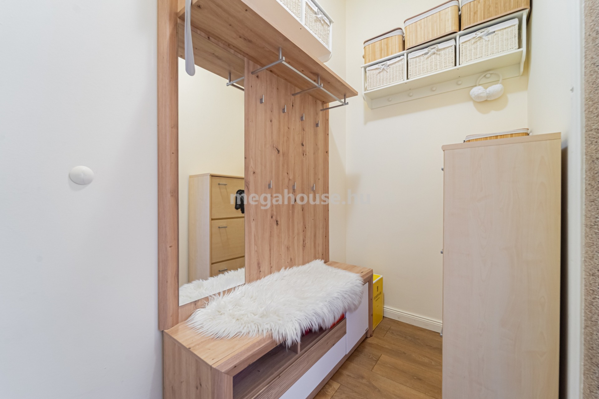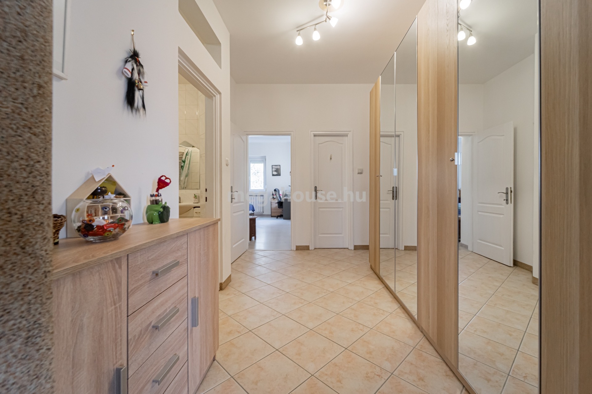 Az étkezőtől jobbra egy gardrób szobaként is funkcionáló előtérből nyílik a két jó méretű és jól bútorozható hálószoba, a zuhanyzóval és káddal is felszerelt fürdőszoba, valamint a külön mellékhelyiség is.