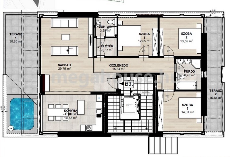 A Ny-tájolású nappali ( 30 nm ) és étkező (19 nm ) egy 30 nm-es hatalmas terasszal kapcsolódik, ahol jakuzzi előkészítés található.