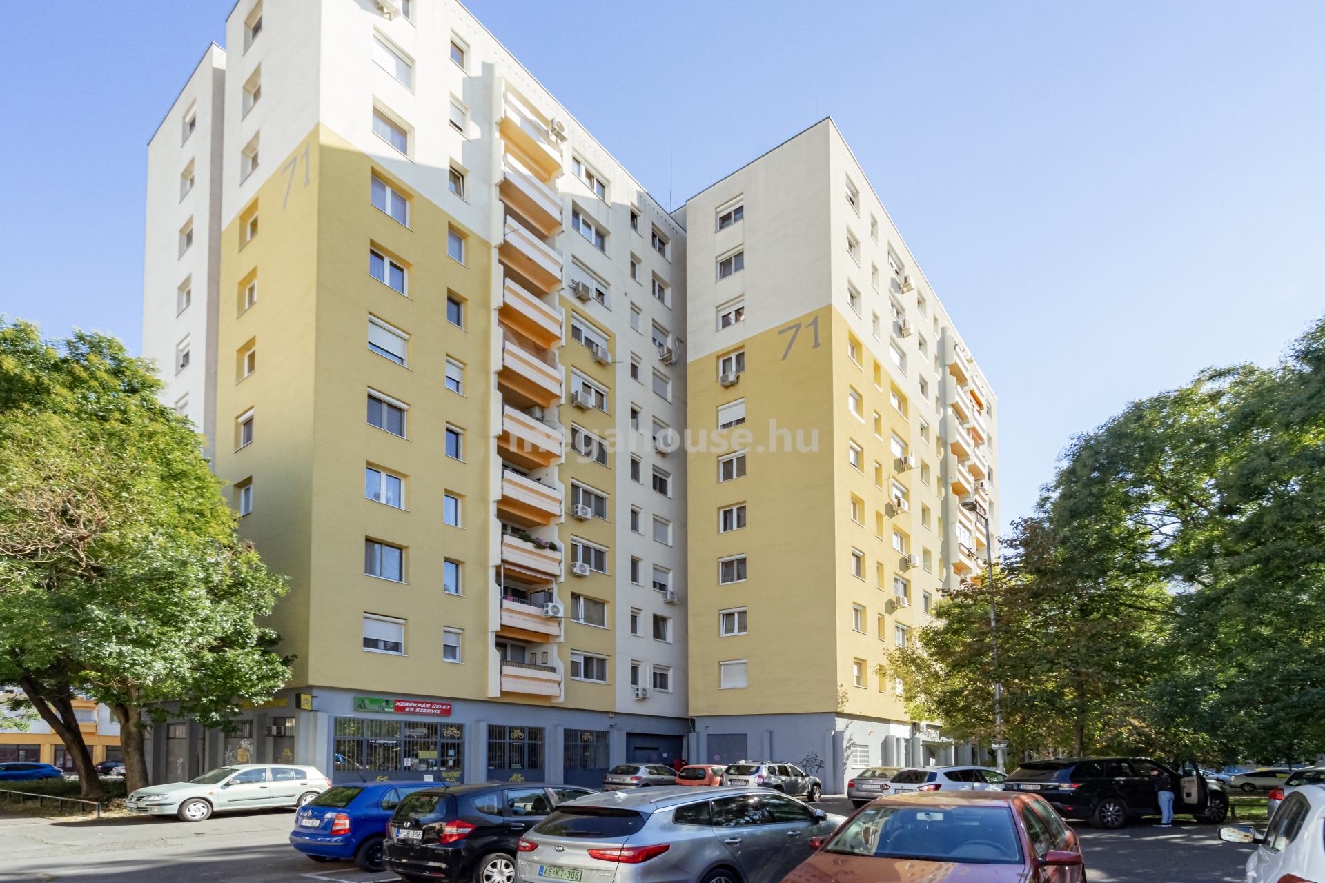 Az 1975 évben épült társasház panelprogram keretében néhány éve külső szigetelést és új festést kapott. Felújított szennyvízcsövekkel rendelkezik. Az épület lépcsőháza jó állapotú, tiszta és rendezett. Nyílászárói és belső lámpái szintén néhány éve lettek cserélve. Az épületben két lift található, az egyik egy kisebb méretű, a másik egy nagyobb, amely költözésnél nagy segítség lehet. A társasház közös területeinek takarítása rendszeres. A ház több oldalán gépjárműparkoló van. A környezete rendezett, szépen parkosított.