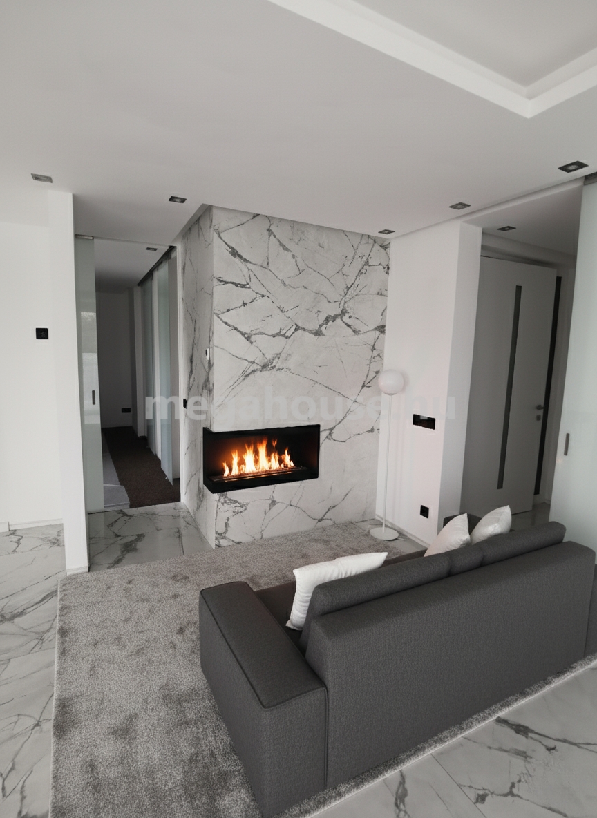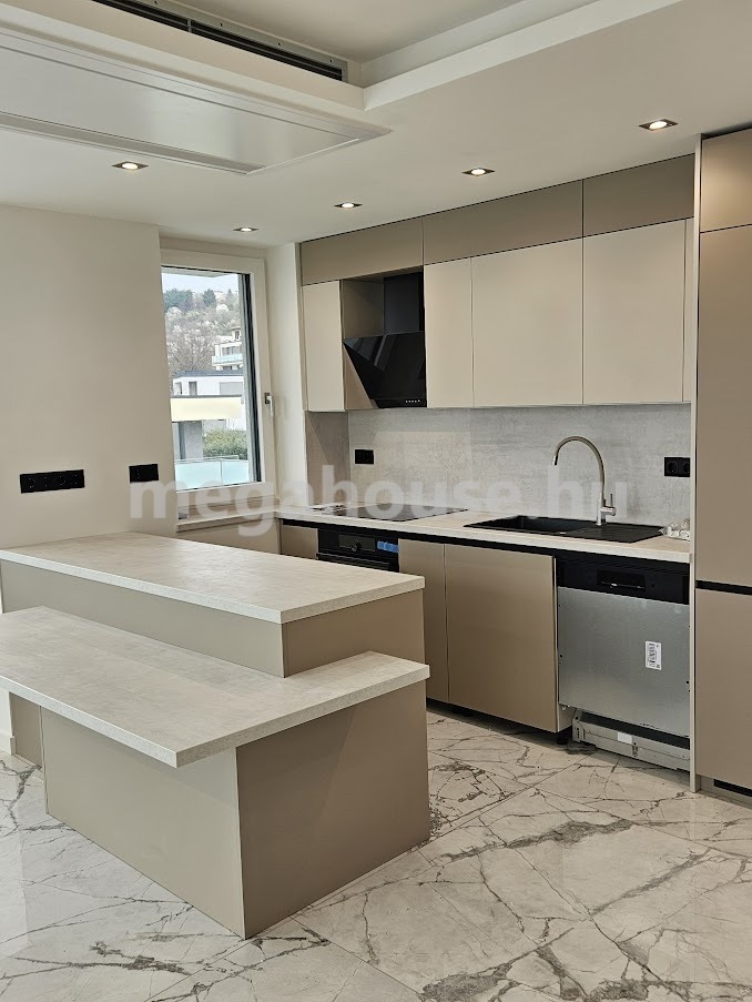 A tágas amerikai konyhás nappali 37 nm-es , ahonnan szép kilátás nyílik a nagyméretű üvegfalakon keresztül a Budai hegyekre. Beépített gépesített konyhabútor és látványkandalló került felszerelésre.