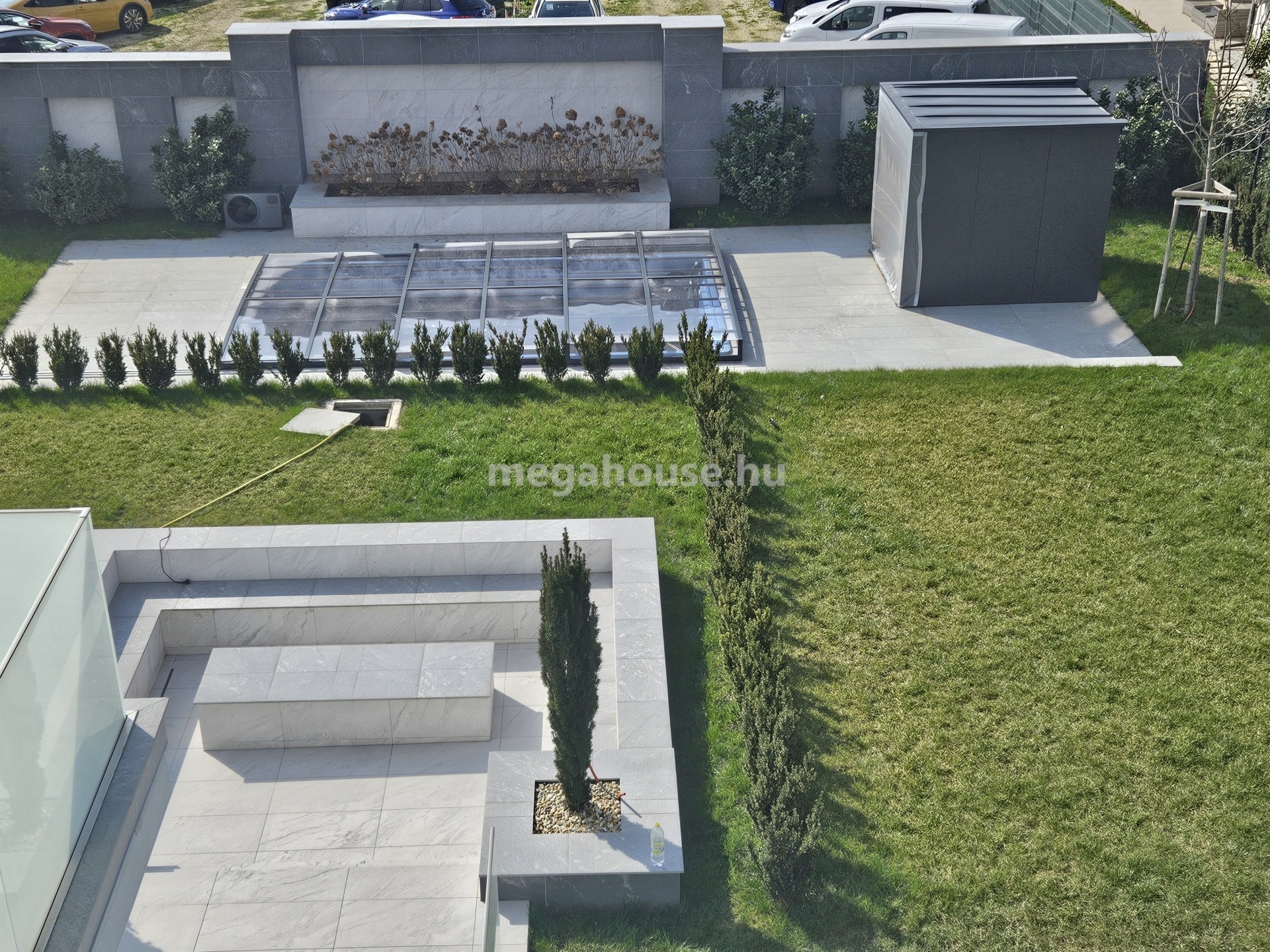 A szépen növényesített modern minimál stílusú közös kertben szabadtéri úszómedence és szauna biztosítja a lakók kényelmét.