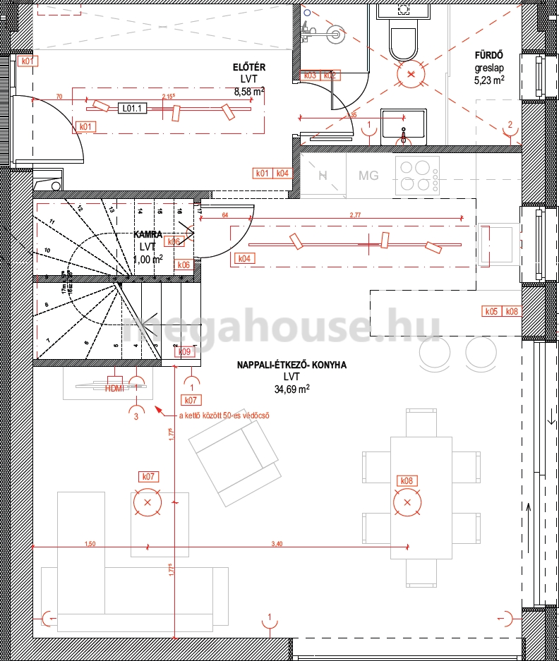 FÖLDSZINT: amerikai konyhás DNY-i tájolású nappali étkezővel,zuhanyzós fürdőszoba, háztartási helyiség, tágas előszoba beépített szekrénnyel. A 13 nm-es DK-i terasz kapcsolódik a nappalihoz, ahonnan a szépen növényesített gondozott kertbe léphetünk ki.