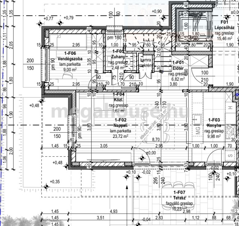 A NY-i tájolású amerikai konyhás nappali nagy üvegfelületekkel rendelkezik. A félig fedett terasz 15 nm nagyságú, innen léphetünk majd ki a gyönyörűen kiépített kertbe. A földszinten egy dolgozószoba, kamra és vendég mosdó kapott helyet.