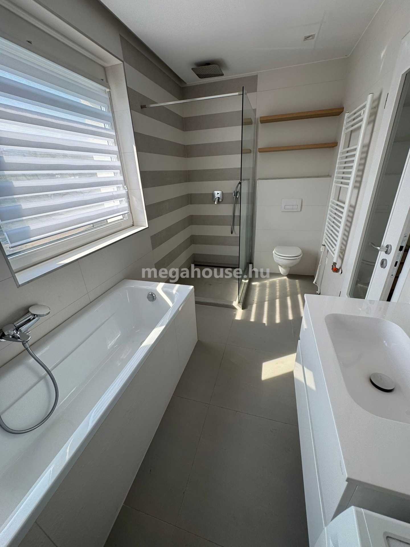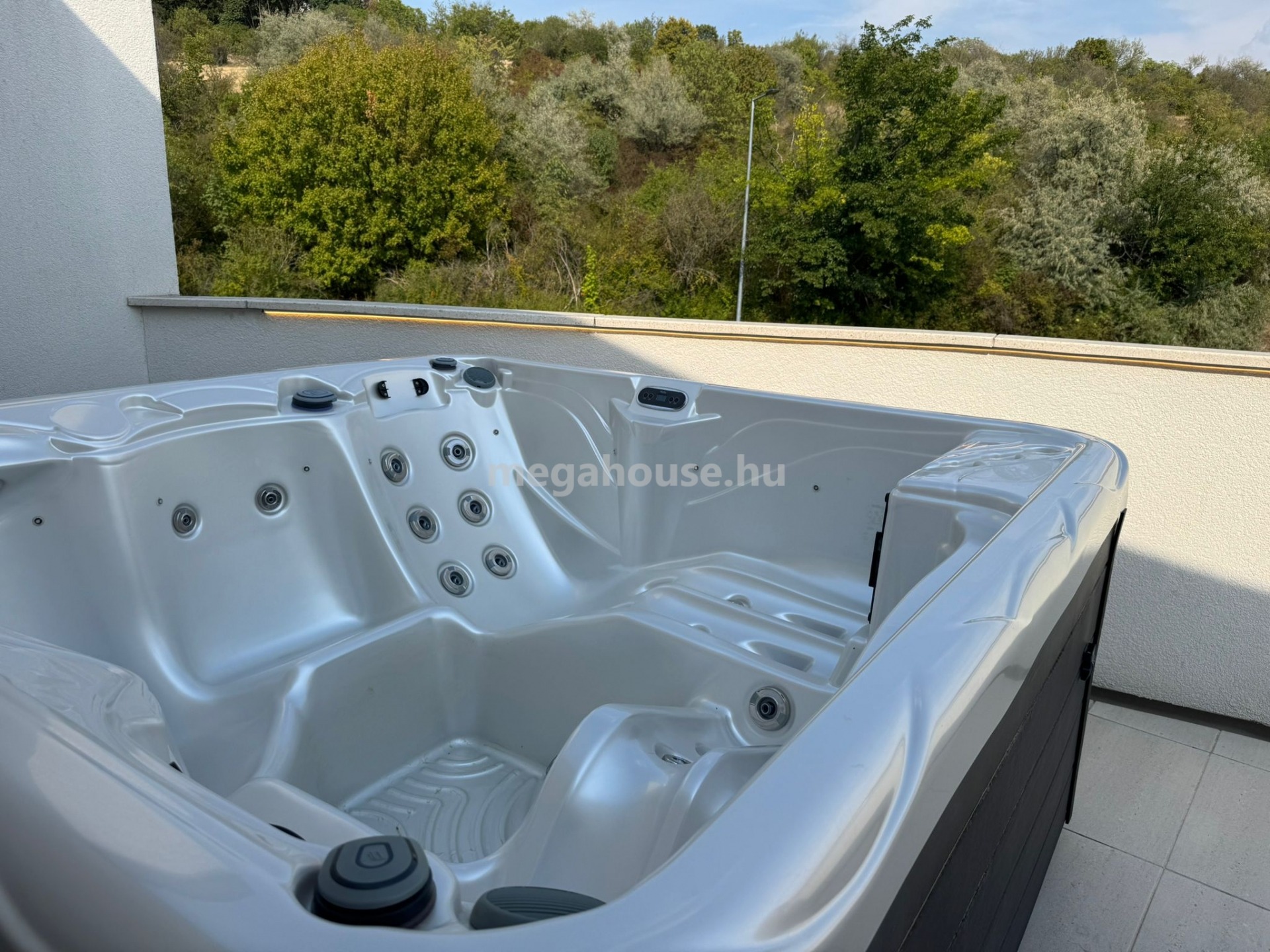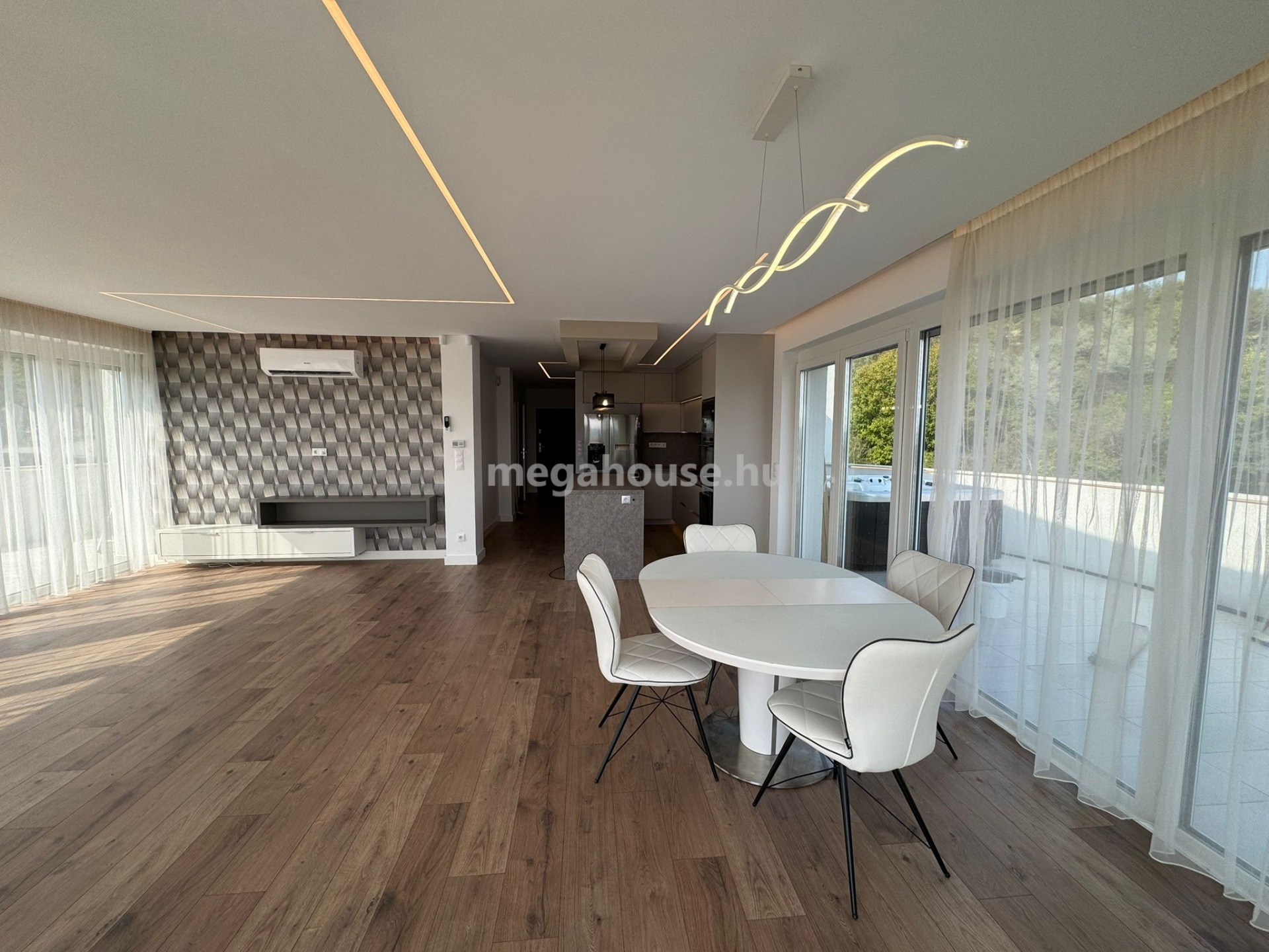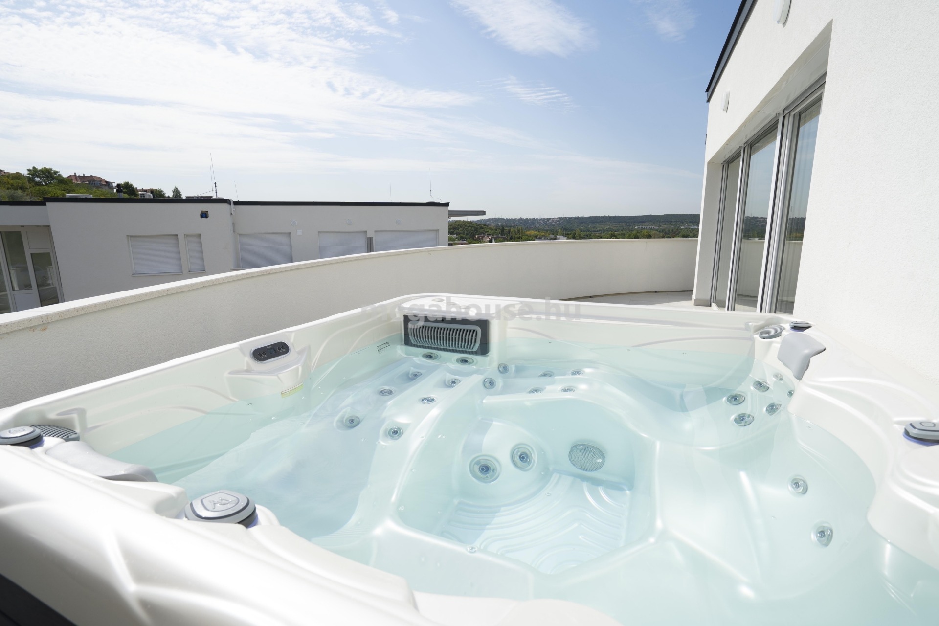 Különleges fénytechnika minden helységben, riasztó, klíma , redőny , tároló. A teraszon jakuzzi várja a pihenni vágy új lakót.