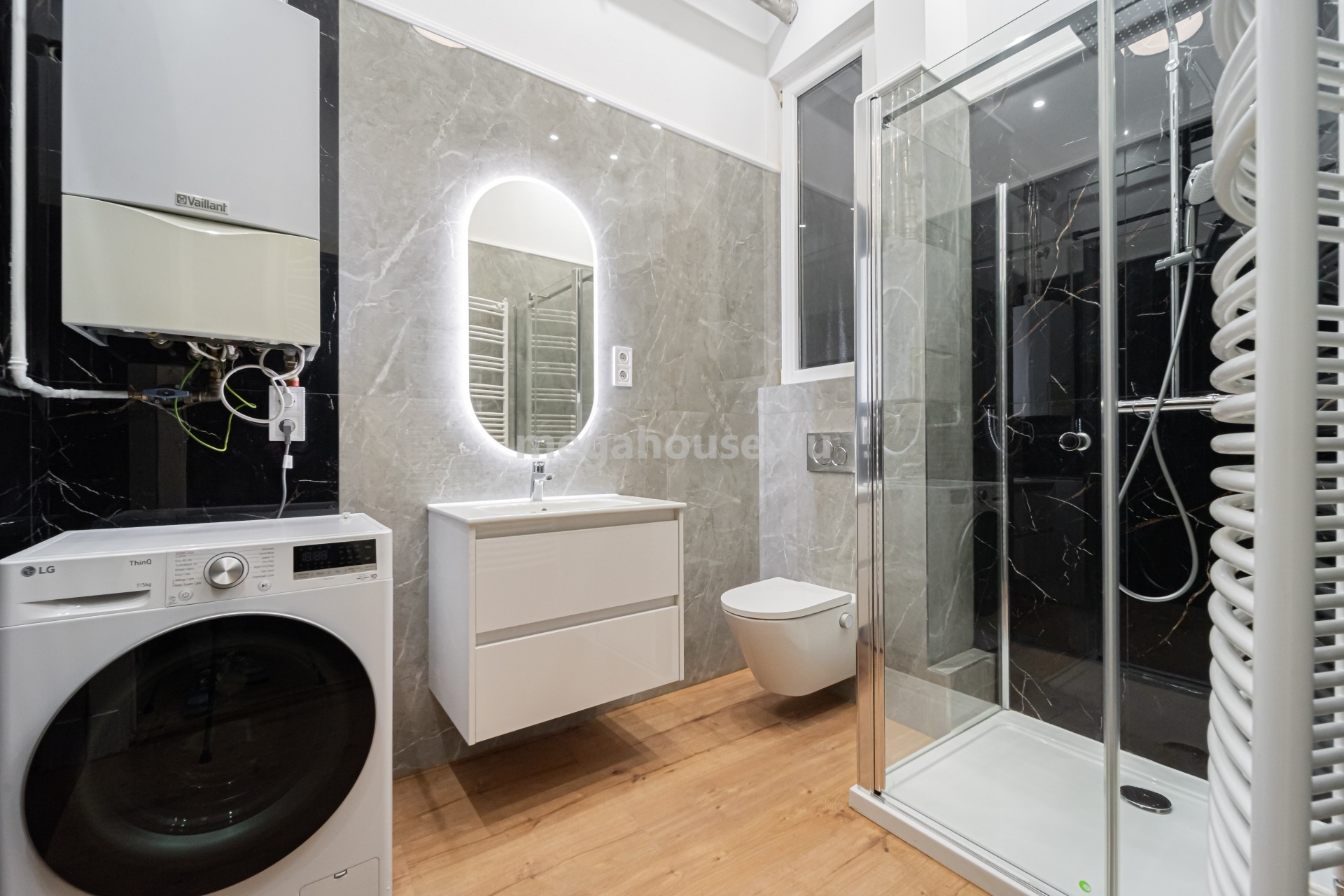 A fürdőszoba elegáns nagyméretű burkolatai, exkluzív zuhanyblokkja tovább emeli a lakás színvonalát.