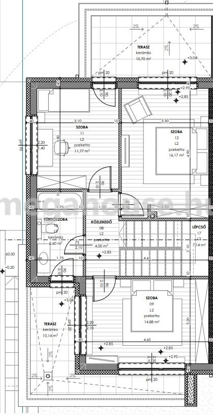 Emelet: 59,56 m² + két erkély (10 m² és 11 m²)