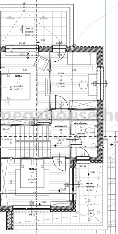 Emelet: 59,56 m² + két erkély (10 m² és 11 m²)