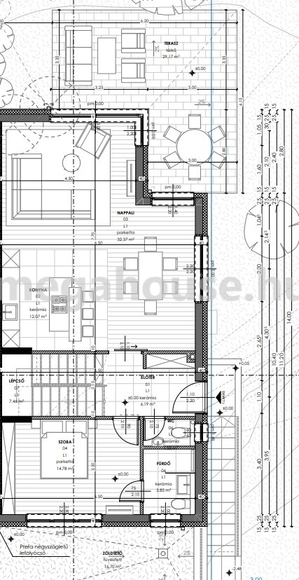 Garázsszint (-1): 47,02 m² – saját, 2 állásos garázs