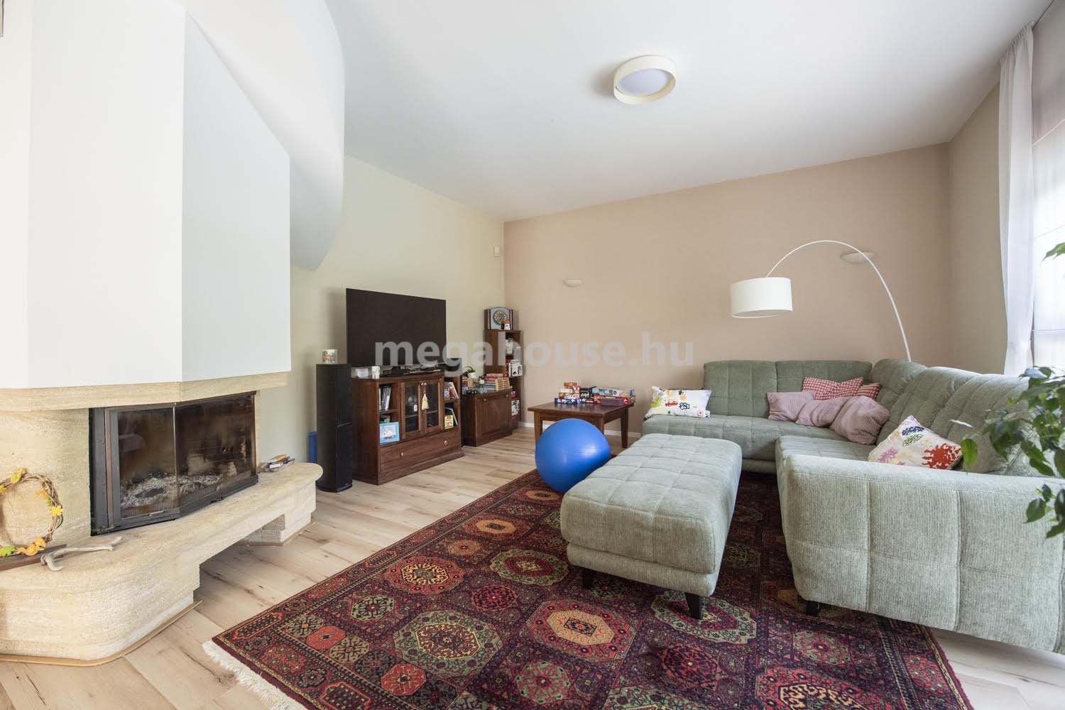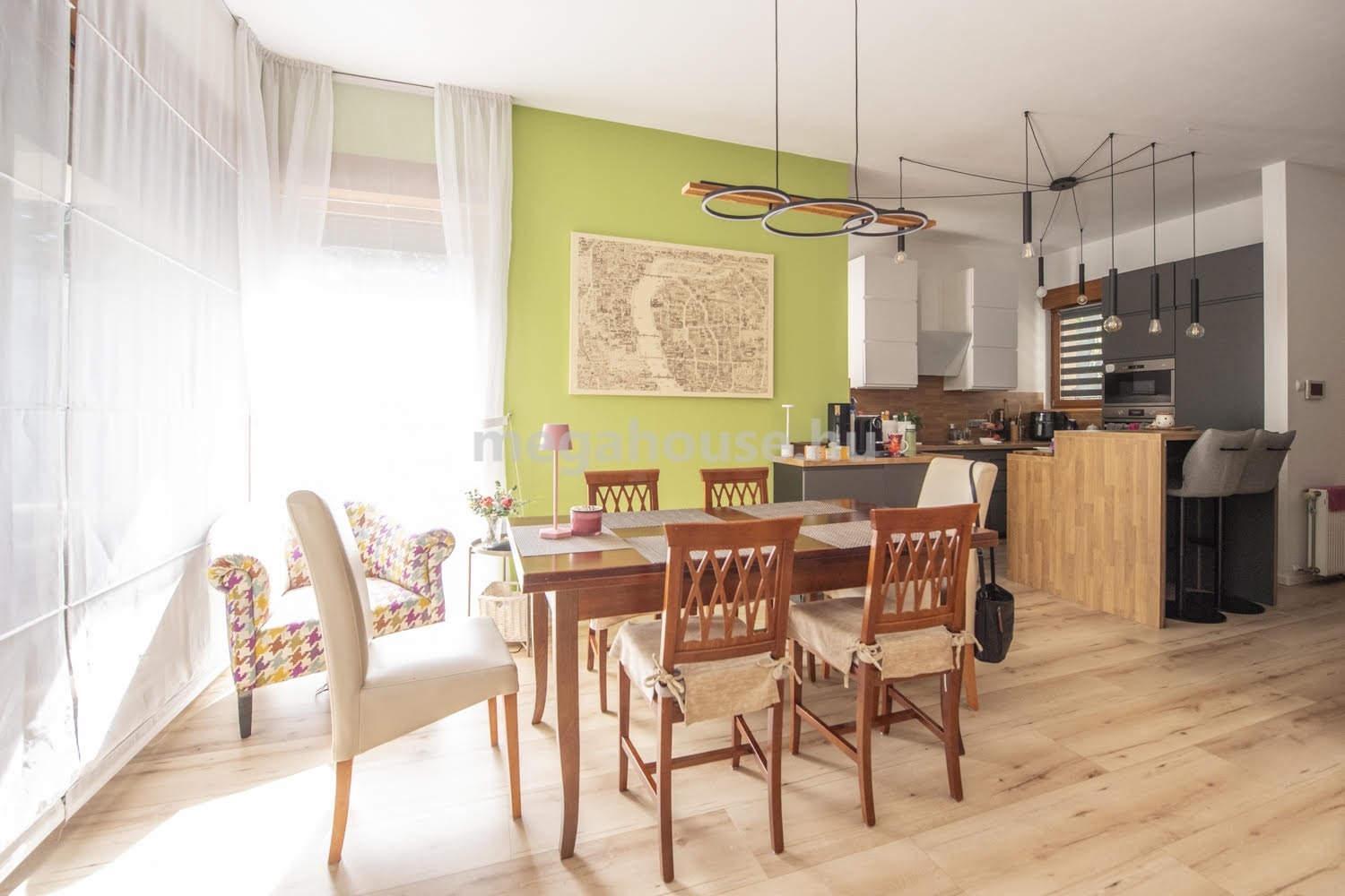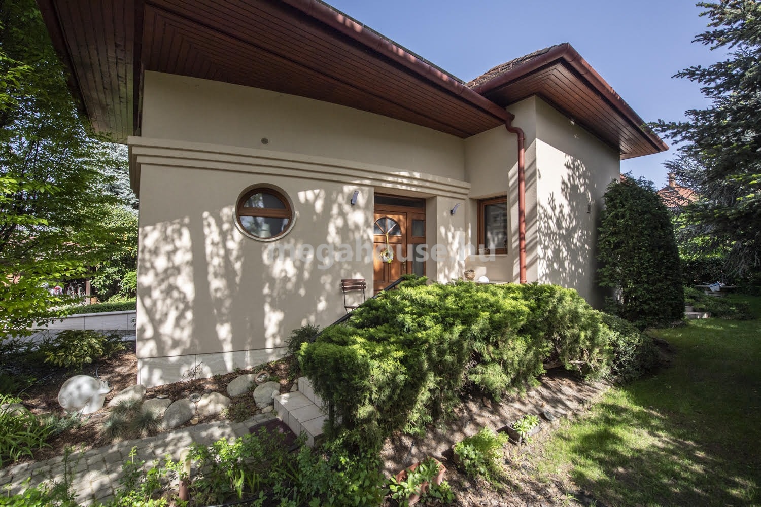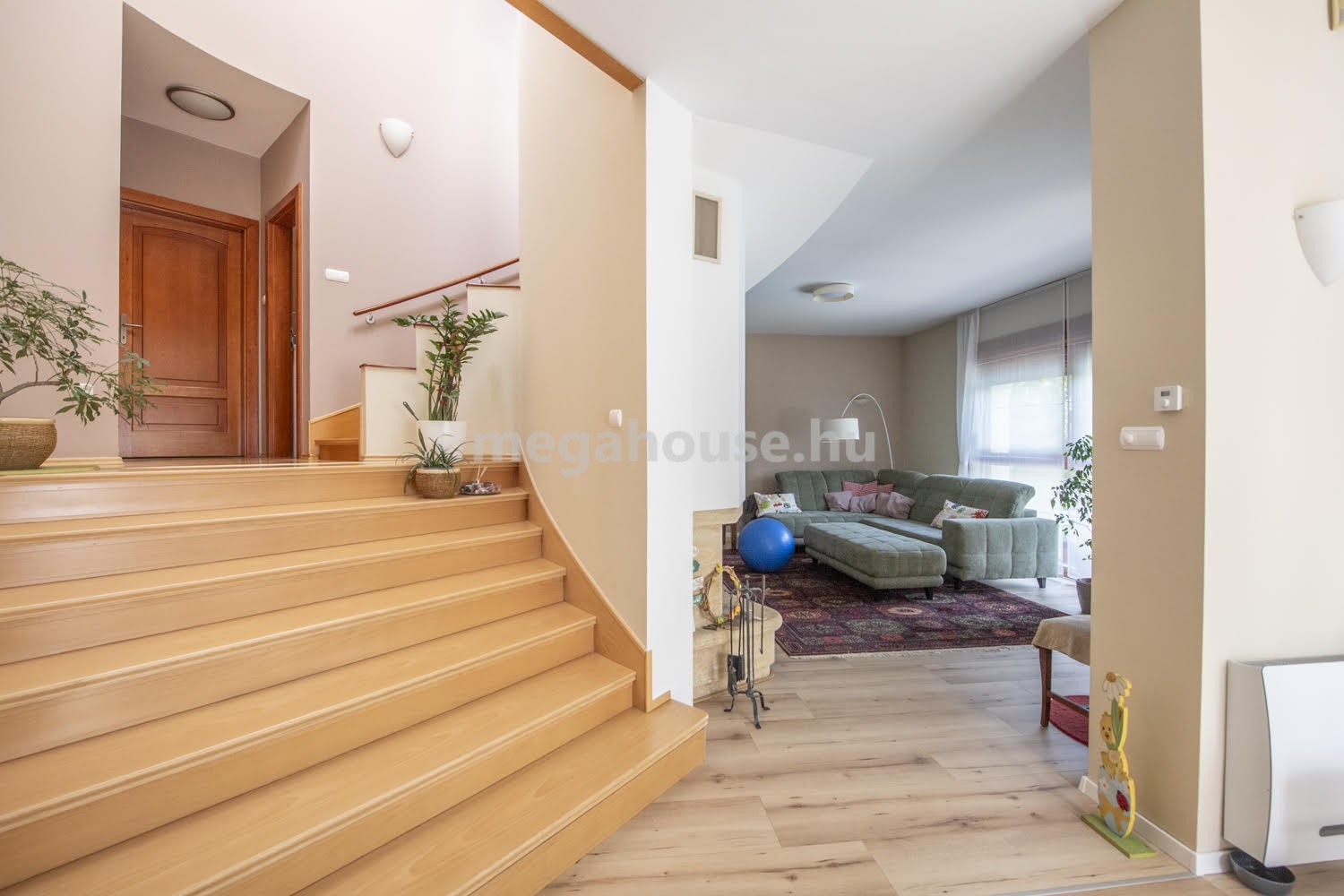 A ház nagyon jó elosztású. A földszinten található egy teljeskörűen felújított és gépesített konyha, mellette egy kényelmes étkező helyiség, azon túl pedig egy gyönyörű kandallóval felszerelt, nagy belmagasságú, impozáns nappali. Innen nyílik a 15 nm-es napellenzővel felszerelt terasz, ahonnan a szépen gondozott, öntözőrendszerrel ellátott, örökzöldekkel beültetett intim kertbe érünk.