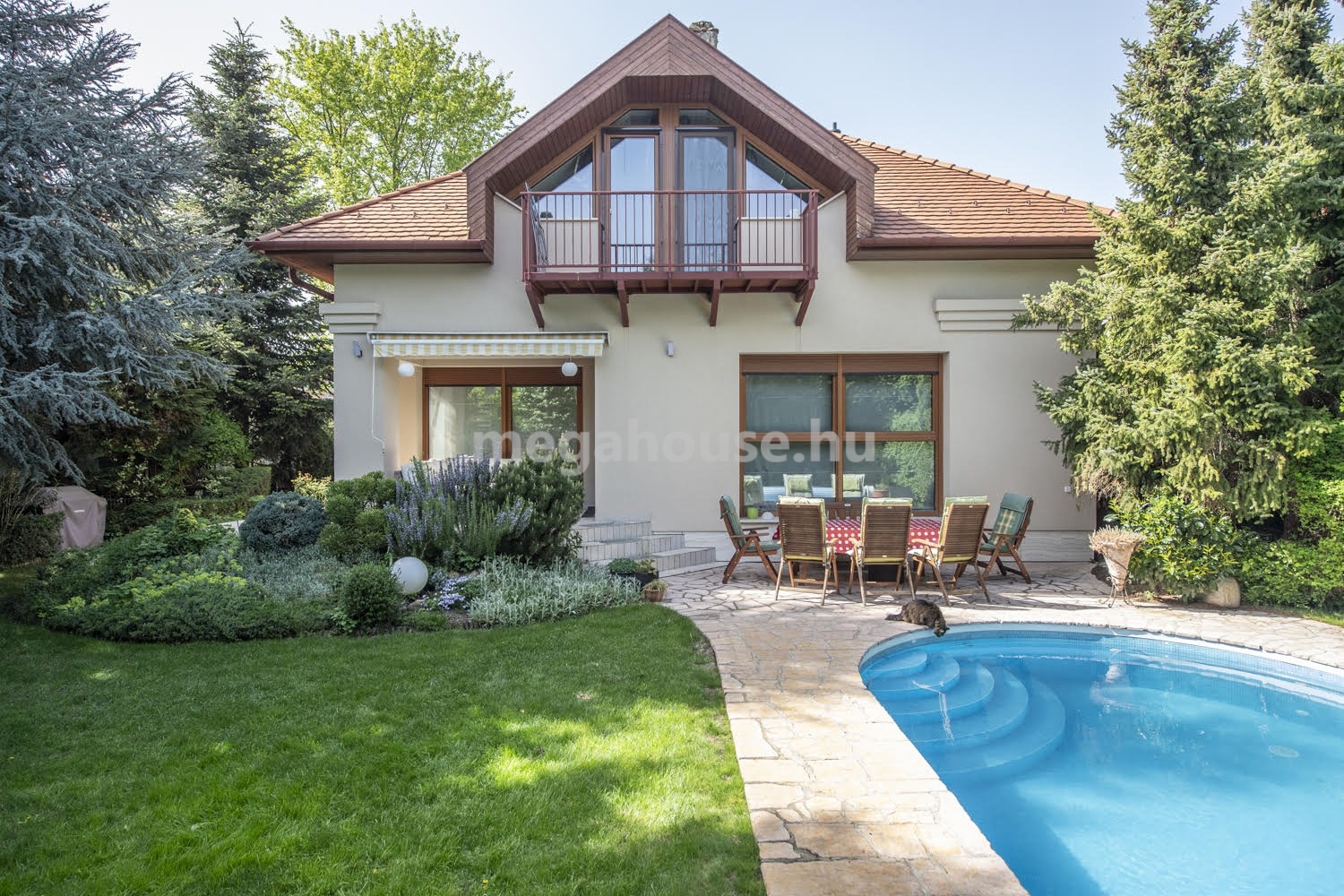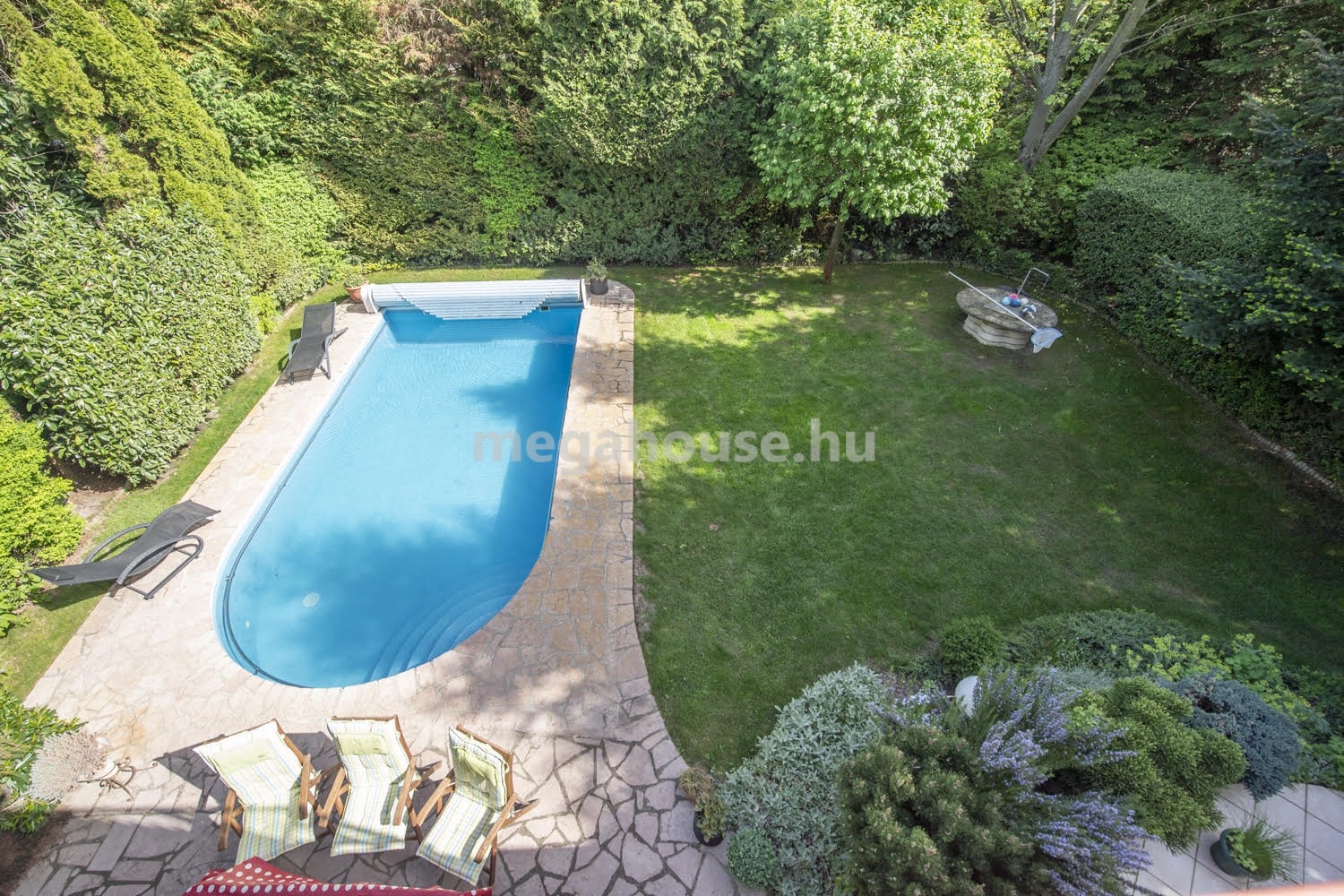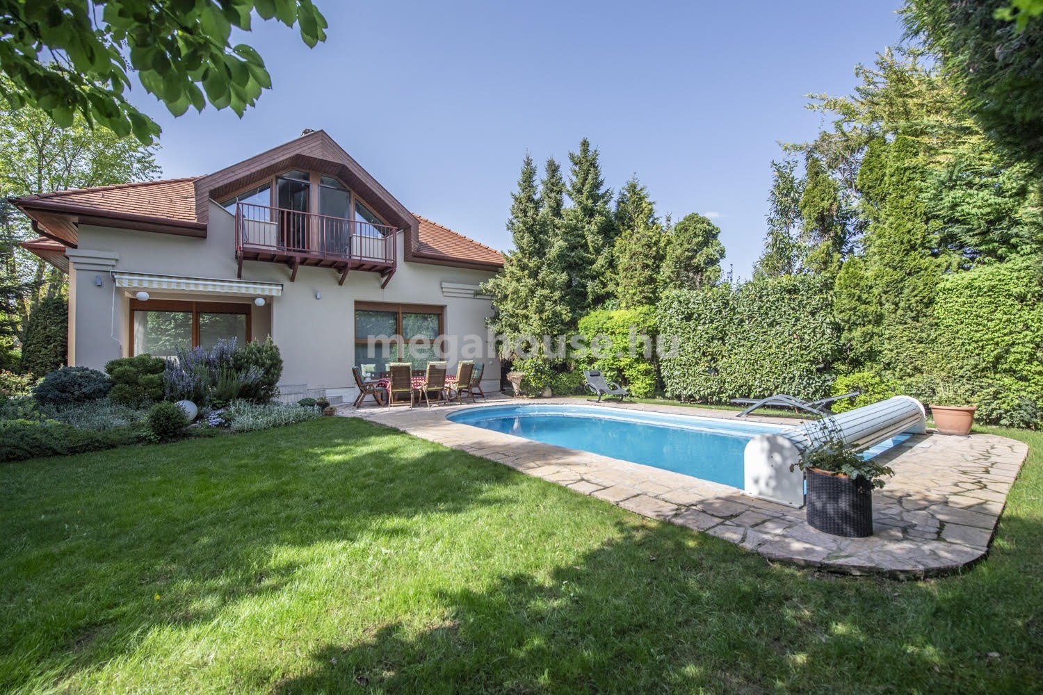 Itt található a 8x4 m-es medence, mely távirányítós rolóval zárható, automata vegyszeradagolóval és hőszivattyús fűtéssel rendelkezik.