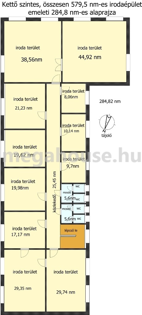 A földszinten nagy tárgyaló, irodák, raktárak és egy 100 nm-es lakás, valamint szociális helyiségek találhatók, az emeleti részen 11 iroda és szociális helyiségek.